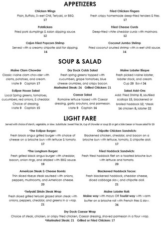The dishes we can’t get enough of are the lobster corn chowder, French dip prime rib sandwich, haddock cakes, coconut shrimp, bacon wrapped scallops, chicken Caesar salad, southwest blackened chicken wrap, and chicken carbonara, but you can also always order the more classic fresh Maine seafood dishes that deliver that dependable Downeast comfort.